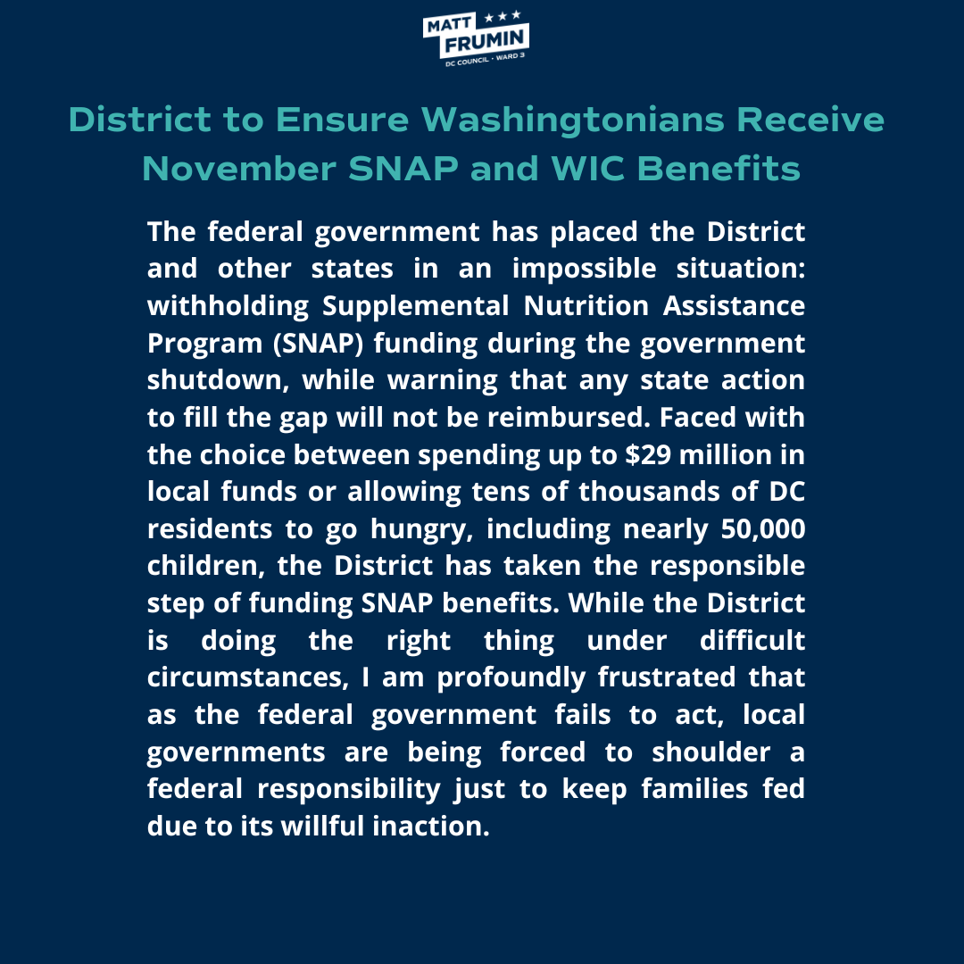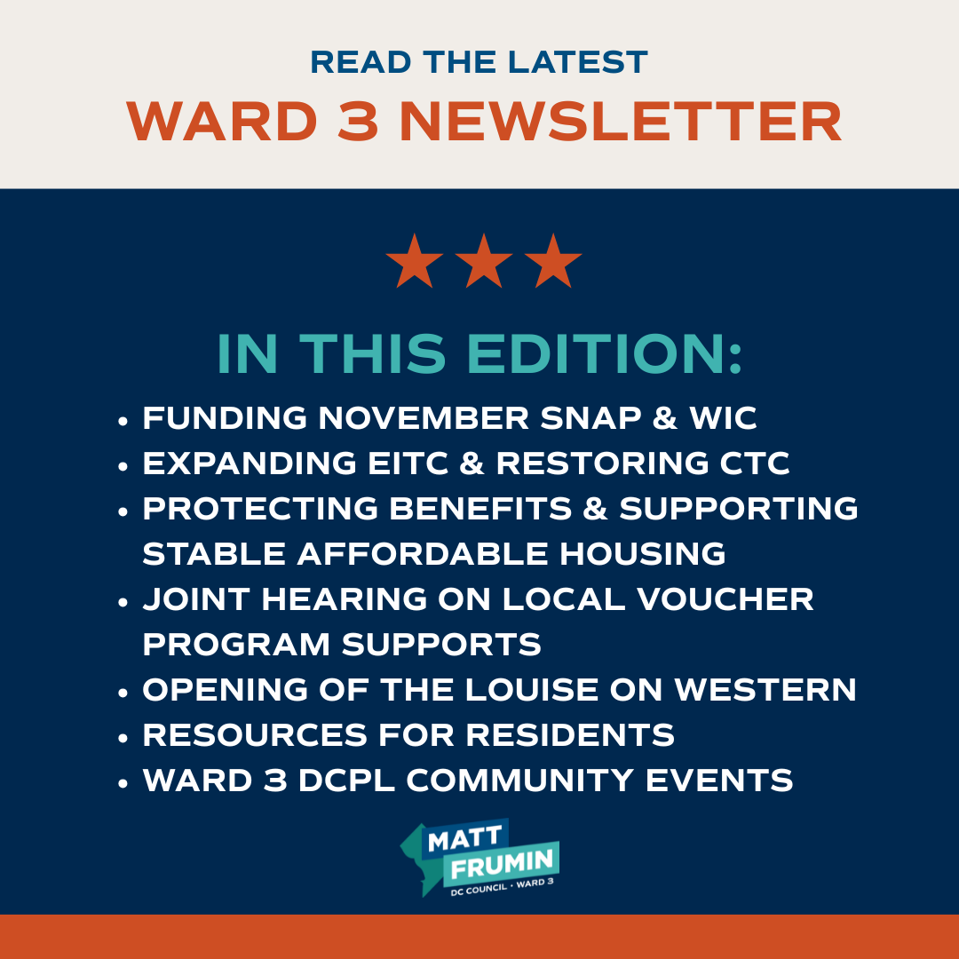 Matt Frumin is a dedicated community activist and longtime Ward 3 resident. Equipped with decades of experience building coalitions, uniting neighbors, and securing quality of life improvements, he now represents Ward 3 residents as their Councilmember.